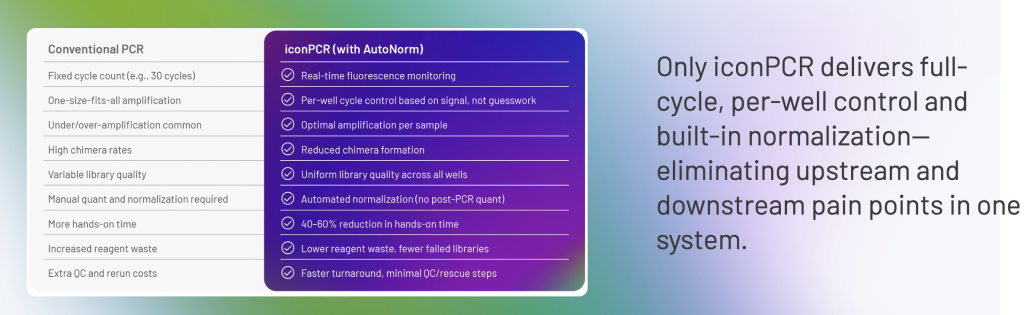 ICON PCR is a next-generation PCR platform that combines amplification and normalization in a single step, streamlining library preparation for next-generation sequencing (NGS). With real-time per-well monitoring and adaptive control, ICON PCR delivers uniform libraries, reduced bias, and higher accuracy — all while saving time and cost in the lab.